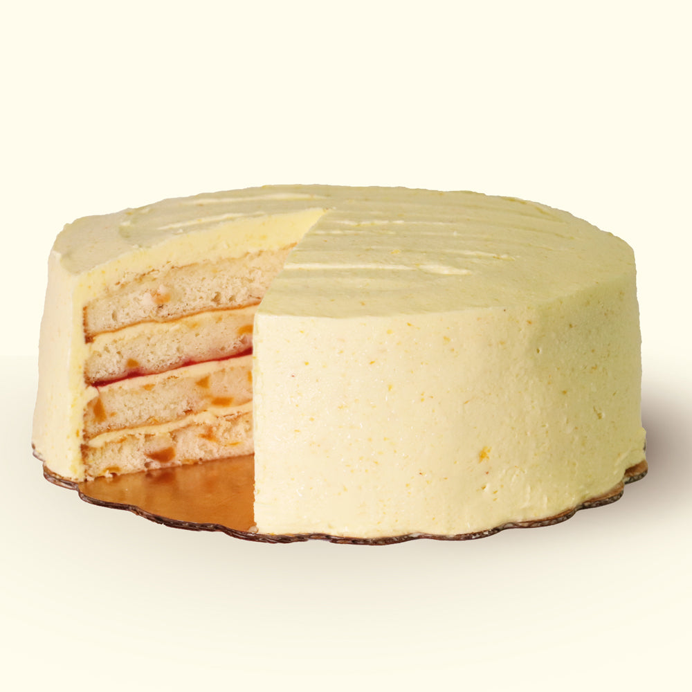 Pretty as a peach, and the perfect summer treat. Fresh peaches are baked into four layers of tender white cake, and each layer is filled and iced with a peach puree buttercream. An added skim of raspberry coulis gives it a bright and beautiful zip.