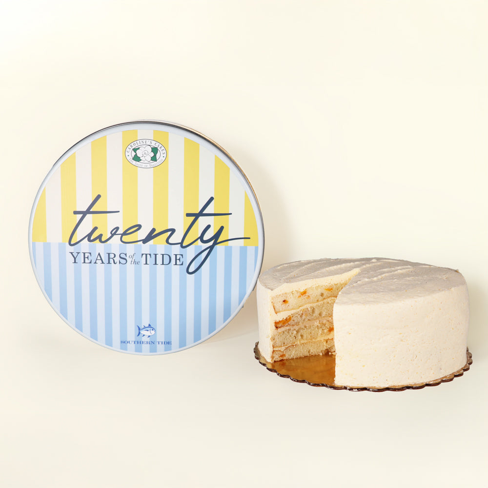 A celebration of Southern heritage and sweet tradition, our limited-edition Peach Caramel Cake features four layers of moist peach cake filled with alternating swirls of peach buttercream and caramel buttercream, then beautifully iced in luscious peach buttercream. Created in partnership with Southern Tide to honor their 20th anniversary, this cake captures the flavor of ripe Carolina peaches with the warmth of caramel in every slice.